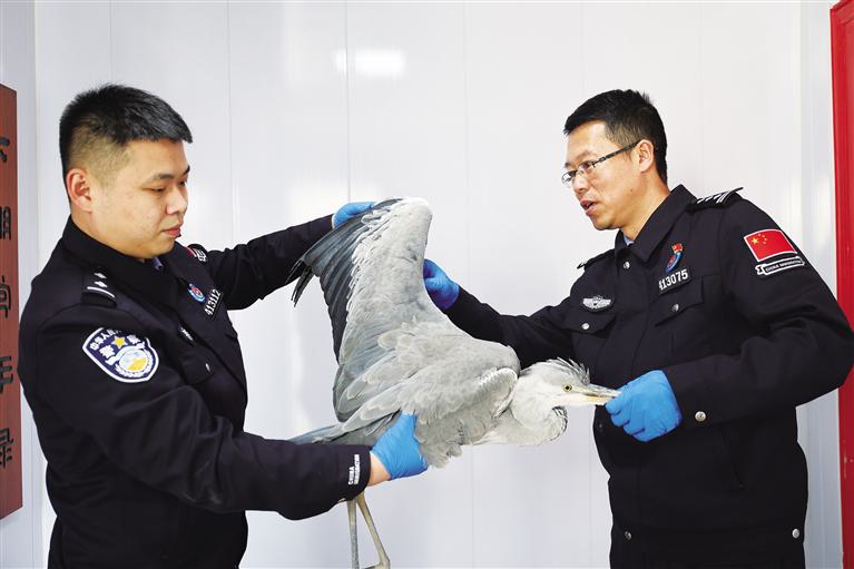近日,甘肃边检总站酒泉边境管理支队明水边境派出所民警巡逻时发现一只翅膀受伤、无法飞行的野生鸟类,随即联系野生动物保护机构进行后续处置。经确认,该鸟为国家二级保护动物苍鹭。